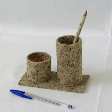 PORTA-LÁPIS E CLIPS (11X15X7 CM) EM PAPELÃO REVESTIDO COM PAPEL RECICLADO, EM TONS DE MARROM. NO FUNDO DA BASE, ETIQUETA DO FABRICANTE 'PAPIRUS DO SERTÃO / [email protected]'. ACOMPANHA LÁPIS GRAFITE, REVESTIDO COM MESMO MATERIAL.