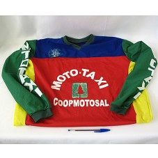 CAMISETA DE MANGA COMPRIDA, NAS CORES VERMELHA, AZUL, VERDE E AMARELA. NA FRENTE, A INSCRIÇÃO 'MOTO-TAXI / COOPMOTOSAL'. NAS MANGAS, 'MOTO TÁXI'. ATRÁS, 'MOTO-TAXI 54 / DROGARIA BIG BEN SAL'.