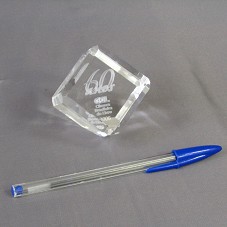 PEÇA (5X5X5 CM) EM FORMATO DE UM CUBO, EM CRISTAL, COM ARESTAS BISOTADAS E UMA DAS PONTAS CORTADA. NO INTERIOR, INSCRIÇÃO TRIDIMENSIONAL '60 ANOS / CBL / CÂMARA BRASILEIRA DO LIVRO 2006'. ACONDICIONADA EM ESTOJO AZUL, TENDO NA TAMPA, MESMA INSCRIÇÃO.