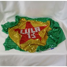 BANDEIRA (93X150 CM) DO BRASIL, CONFECCIONADA EM TECIDO COM LANTEJOULA, TENDO AO CENTRO ESTRELA VERMELHA COM A INSCRIÇÃO 'LULA 13'.