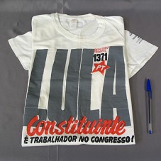 CAMISETA (TAM M) EM MALHA BRANCA, DE MANGA CURTA. NA FRENTE, ESTAMPA EM CINZA, VERMELHO E PRETO, COM A INSCRIÇÃO 'LULA CONSTITUINTE / É TRABALHADOR NO CONGRESSO / DEPUTADO FEDERAL 1371 PT'.