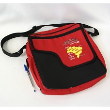 BOLSA EM NYLON VERMELHO, COM DETALHES EM PRETO E ALÇA COMPRIDA. NA FRENTE, MAPA DO BRASIL EM AMARELO E A INSCRIÇÃO 'ENCONTRO NACIONAL DOS DEMITIDOS E ANISTIADOS / 27,28,29 E 30 DE AGOSTO/2006 / BRASÍLIA-DF / ANISTIA AMPLA, GERAL E IRRESTRITA'.