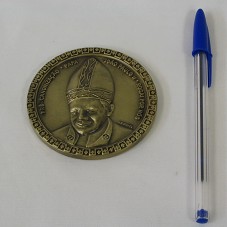 MEDALHA (80 MM) EM BRONZE. NO ANVERSO, EFÍGIE DO PAPA JOÃO PAULO II, E A INSCRIÇÃO 'PRÓ-CANONIZAÇÃO PAPA JOÃO PAULO II / ROGAI POR NÓS'. NO CANTO INFERIOR DIREITO, NOME DO ARTISTA 'AURUPIN - 05'. NO REVERSO, UM BRASÃO E A INSCRIÇÃO 'PAPA JOÃO PAULO II / O BEM-AVENTURADO APÓSTOLO DO AMOR E DO PERDÃO / COM DIVINA HUMILDADE E INSPIRAÇÃO ABENÇOOU O MUNDO BEIJANDO-LHE O CHÃO'. ACONDICIONADO EM ESTOJO FORRADO DE VELUDO AZUL. NA PARTE INTERNA DA TAMPA, ETIQUETA COM DADOS DO AUTOR. ESTOJO GUARDADO EM CAIXA DE PAPELÃO BRANCO.