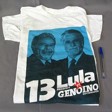 CAMISETA (TAM G) EM MALHA BRANCA, DE MANGA CURTA. NA FRENTE, ESTAMPA EM AZUL E PRETO, COM FOTOGRAFIA DE LULA E JOSÉ GENOÍNO, E A INSCRIÇÃO '13 LULA PRESIDENTE / GENOINO GOVERNADOR'. ATRÁS, ESTRELA VERMELHA COM O NÚMERO '13'.