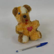 CACHORRO DE PELÚCIA (18 CM), NAS CORES MARROM E LARANJA. POSSUI, NA PARTE FRONTAL, UM CORAÇÃO VERMELHO COM A INSCRIÇÃO 'COM CARINHO'. ACONDICIONADO EM CAIXA DE ACETATO AZUL, COM ADESIVO DA CAMPANHA ELEITORAL 2006 DO PRESIDENTE LULA'.