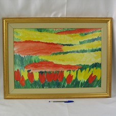 PINTURA (36,5X53,5 CM) AQUARELADA SOBRE PAPEL CANSON, RETRATANDO UM CAMPO DE TULIPAS VERMELHAS E AMARELAS. NO CANTO INFERIOR DIREITO, ASSINATURA DA ARTISTA 'PIAZZETTA'. POSSUI MOLDURA (50X67 CM) EM MADEIRA PINTADA DE DOURADO, COM PASSE-PARTOUT NA COR BEGE E FRISO DOURADO, E TAMPO DE VIDRO.