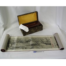 PINTURA (25X530 CM) EM PERGAMINHO DE SEDA (30X688 CM). POSSUI FUNDO EM TONALIDADE DOURADO-ACINZENTADO, COM IMAGEM EM PRETO. GRAVURA MOSTRA A VISTA PANORÂMICA DO RIO BIAN EM QINGMING, NA CHINA DO SÉCULO XII, RETRATANDO O COTIDIANO DA ÉPOCA. ACOMPANHA PAR DE LUVAS BRANCAS E UM CERTIFICADO DE COLECIONADOR. ACONDICIONADO EM CAIXA DE MADEIRA, E ESTA EM CAIXA FORRADA DE TECIDO MARROM COM DESENHOS EM DOURADO.