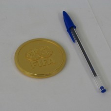 MEDALHA (68 MM) EM METAL DOURADO. NO ANVERSO, DESENHO DE DUAS BOLAS DE FUTEBOL COM O MAPA MUNDI GRAVADO NELAS, E A INSCRIÇÃO 'FIFA'. NO REVERSO, 'FEDERATION INTERNATIONALE DE FOOTBALL ASSOCIATION' E, NO CENTRO, A INSCRIÇÃO 'PRESIDENTIAL VISIT' E UMA ASSINATURA. ACONDICIONADO EM ESTOJO FORRADO DE COURO PRETO.