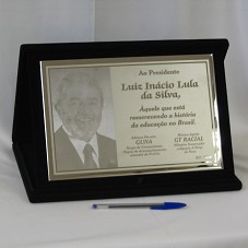 PLACA (20X29,5 CM) EM INOX, COM BORDAS POLIDAS E INTERIOR FOSQUEADO. POSSUI FOTOGRAFIA DO PRESIDENTE LULA E A INSCRIÇÃO 'AO PRESIDENTE LUIZ INÁCIO LULA DA SILVA, ÀQUELE QUE ESTÁ REESCREVENDO A HISTÓRIA DA EDUCAÇÃO NO BRASIL. / ADRIANA FERREIRA / GUNA - GRUPO DE UNIVERSITÁRIOS NEGROS DE ACOMPANHAMENTO ORIUNDOS DO PROUNI / MÕNICA AGUIAR / GT RACIAL / NILMÁRIO GOVERNADOR / COLIGAÇÃO A FORÇA DO POVO / BH- 09/06'. ACONDICIONADA EM ESTOJO FORRADO DE VELUDO PRETO, ONDE ESTÁ FIXADA.