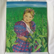QUADRO SEM MOLDURA, COM PINTURA (100X80 CM) SOBRE TELA FIXADA EM CHASSIS DE MADEIRA. RETRATA UMA MENINA LOIRA, DE OLHOS CLAROS, COM VESTIDO EM XADREZ LILÁS E ENFEITE NOS CABELOS, ENTRE UM MILHARAL. PREDOMINA OS TONS DE VERDE E AZUL. NO CANTO INFERIOR DIREITO, ASSINATURA DA ARTISTA, 'ADRIANA COSTA 2002'.