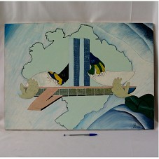 PINTURA (50X70 CM) SOBRE TELA, RETRATANDO O CONGRESSO NACIONAL INSCRITO NO MAPA DO BRASIL, SENDO SEGURADO NOS BRAÇOS. AS CONCHAS, COMO CASCAS DE OVOS, SENDO UMA PISOTEADA POR UM PÉ, QUE LEVA O NÚMERO '45'; E OUTRA, PELO NÚMERO '25'. POSSUI FUNDO EM TONS DE AZUL. NO CANTO INFERIOR DIREITO, ASSINATURA DA ARTISTA 'CIRINO / 10-10-2005'. ATRÁS, INSCRIÇÃO COM NOME E ENDEREÇO DO AGENTE, E 'ME LIGA PRESIDENTE LULA'.
