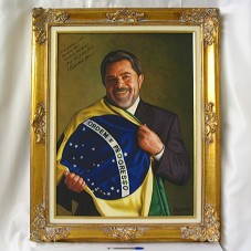 PINTURA (79X58,5 CM) SOBRE TELA, RETRATANDO O PRESIDENTE LUIZ INÁCIO LULA DA SILVA SEGURANDO A BANDEIRA DO BRASIL, QUE ESTÁ SOBREPOSTA SOBRE SEU OMBRO DIREITO. POSSUI FUNDO EM TONS DE MARROM E DOURADO. NO CANTO INFERIOR DIREITO, ASSINATURA DA ARTISTA 'BETTO CALVI 2003'. NO CANTO SUPERIOR ESQUERDO, A INSCRIÇÃO '27 DE OUTUBRO DE 2002 / PARABÉNS, LULA / PARABÉNS, PRESIDENTE / PROF. DR. ANTONIO MACIEL / TARAUACÁ - ACRE'. POSSUI MOLDURA TRABALHADA, PINTADA NA COR DOURADA. ATRÁS, TEXTO ENDEREÇADO AO PRESIDENTE LULA, ASSINADO PELO REMETENTE, DATADO DE 16/10/2006.