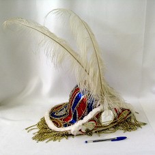 CHAPÉU DE PALHA REVESTIDO EXTERNAMENTE COM LANTEJOULAS NAS CORES AZUL, VERMELHA, PRATA E DOURADA, E MIÇANGAS NA COR DOURADA. POSSUI A BORDA ARREMATADA COM PELÚCIA BRANCA E FRANJAS EM MIÇANGAS DOURADAS. NA FRENTE, ABA COSTURADA PARA CIMA, COM DUAS PLUMAS BRANCAS E TRÊS ESPELHOS COLADOS.