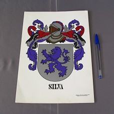 BRASÃO DO SOBRENOME 'SILVA', EM PAPEL TAMANHO A4, MOSTRANDO, NA PARTE INTERNA, A FIGURA DE UM LEÃO ROXO; E, COROADO NA PARTE SUPERIOR POR UM ELMO E FOLHAGENS NAS CORES ROXA, VERMELHO E PRATA.