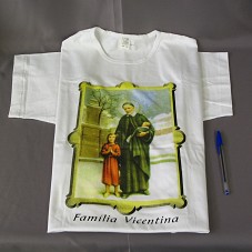 CAMISETA (TAM M) EM MALHA BRANCA, DE MANGA CURTA. NA FRENTE, ESTAMPA COM FOTOGRAFIA DE UM PADRE SEGURANDO UM BEBÊ NO COLO, TENDO AO SEU LADO, UMA OUTRA CRIANÇA. ABAIXO, A INSCRIÇÃO 'FAMÍLIA VICENTINA'. ATRÁS, 'AJUDE NA RECONSTRUÇÃO DA IGREJA SÃO VICENTE / ARAPORANGA / SANTANA DO CARIRI - CE'.