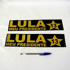 DOIS ADESIVOS (8X31,5 CM) COM FUNDO PRETO E INSCRIÇÃO EM DOURADO MULTICOR, 'LULA / MEU PRESIDENTE / 13'.
