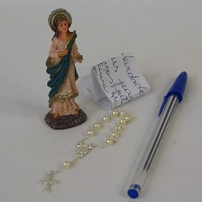 IMAGEM DE SANTA LUZIA, EM RESINA. NA BASE, A INSCRIÇÃO 'SANTA LUZIA'. NO FUNDO, ETIQUETA COM O NOME 'ANGELA'. ACOMPANHA UM TERÇO DE DEDO, COM COM MIÇANGAS IMITANDO PÉROLAS; E, UM BILHETE COM A INSCRIÇÃO 'MOSSORÓ, TERRA DE SANTA LUZIA, DA LIBERDADE / LULA, QUE SANTA LUZIA ILUMINE SEUS PASSOS / ABRAÇOS PETISTAS FÁTIMA MORAIS', E DO OUTRO LADO, 'LULA, CONTINUE LUTANDO E FAZENDO PELO O NOSSO POVO. MOSSORÓ, 16/10/2006'. ACONDICIONADA EM SACO PLÁSTICO.