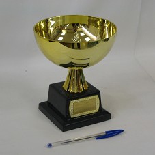 TAÇA (13X15,5X15,5 CM) EM PLÁSTICO DOURADO, COM BASE MULTIFACETADA, POSSUINDO A PARTE INTERNA TRABALHADA COM DESENHOS DE RAMOS. FIXADA EM BASE PLÁSTICA NA COR PRETA, ONDE NA FRENTE HÁ PLACA METÁLICA CONTENDO A INSCRIÇÃO 'HOMENAGEM DO POVO DE J.F. E DO BRASIL AO PR. LULA / A. L. A. V.'.