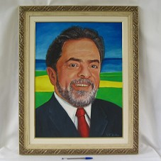 PINTURA (60X45 CM) SOBRE TELA RETRATANDO O PRESIDENTE LULA, TENDO AO FUNDO, AS CORES DA BANDEIRA DO BRASIL. NO CANTO INFERIOR DIREITO, ASSINATURA DO ARTISTA, 'P.C. BECKER'. ATRÁS, NOME E TELEFONE DO AGENTE, E A INSCRIÇÃO 'LUIZ INÁCIO LULA DA SILVA / PRESIDENTE DO BRASIL / O/S/T Nº 0402 / PEDRO CANDIDO BECKER / DIM 0,60X0,45 / ANO 2003 / CURITIBA-PR / BRASIL'. POSSUI MOLDURA EM MADEIRA CLARA E TRABALHADA; PASSE-PARTOUT COM PÁTINA E FRISO DOURADO.