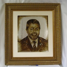 PINTURA (60X50 CM) SOBRE ALUMÍNIO EM RELEVO, EM TOM ACOBREADO, RETRATANDO O PRESIDENTE LULA. NO CANTO INFERIOR DIREITO, ASSINATURA DO ARTISTA, 'CARLUS LISBOA 2006'. ATRÁS, FOLHA COM BREVE BIOGRAFIA DO ARTISTA. POSSUI MOLDURA EM MADEIRA TRABALHADA E PINTADA DE DOURADO; PASSE-PARTOUT EM TECIDO BEGE.