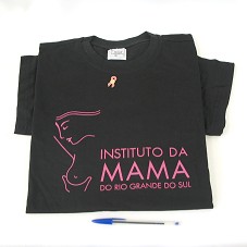 CAMISETA (TAM GG) EM MALHA PRETA, DE MANGA CURTA. NA FRENTE, EM ROSA, 'INSTITUTO DA MAMA DO RIO GRANDE DO SUL' E LOGOMARCA, DESENHO DE UMA MULHER FAZENDO O AUTO EXAME DA MAMA. ACOMPANHA UM BROCHE EM METAL DOURADO, NO FORMATO DE UM LAÇO ROSA, TENDO AO CENTRO A LOGOMARCA DO INSTITUTO; E UM FOLDER 'CONHECER, PREVENIR E TRATAR É SÓ COMEÇAR'.