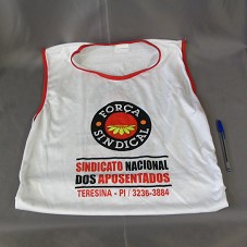 CAMISETA REGATA (TAM G) EM MALHA BRANCA COM DETALHES VERMELHOS. NA FRENTE, LOGOMARCA DA 'FORÇA SINDICAL' E A INSCRIÇÃO 'SINDICATO NACIONAL DOS APOSENTADOS / TERESINA-PI / 3236-3884'. ATRÁS, MESMA ESTAMPA E 'CAMINHAR FAZ BEM A SAÚDE'. ACOMPANHA CARTÃO DE VISITA DO REMETENTE, CONTENDO NO VERSO, A INSCRIÇÃO 'É O SEGUNDO CARTÃO QUE TE DOU, QUERO VER PÓS ELEIÇÃO / ABREU'.