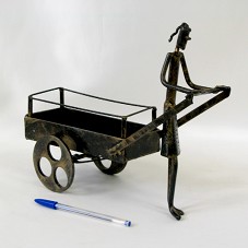 ESCULTURA (25,5X30X11 CM) EM FERRO, RETRATANDO UMA MULHER PUXANDO UMA CARROÇA. ESCULTURA COM PINTURA PRETA E RAJADOS EM DOURADO.