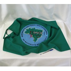 DUAS BANDEIRA IGUAIS (70X88 CM) EM TECIDO VERDE, TENDO AO CENTRO, ESTAMPA COM CÍRCULO AZUL E LOGOMARCA DO 'MOVIMENTO NACIONAL DOS CATADORES DE MATERIAIS RECICLÁVEIS / MNCR'.