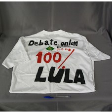 CAMISETA (TAM GG) EM MALHA BRANCA, DE MANGA CURTA. ATRÁS, PINTURA COM A INSCRIÇÃO 'DEBATE. ONTEM / DOMINGO / 08-10-06 / 100% LULA'.
