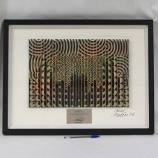 QUADRO (49X64,5 CM) COM MOLDURA PRETA TIPO CAIXA, PASSE-PARTOUT BRANCO E TAMPO DE VIDRO. EMOLDURA GRAVURA (29,5X43 CM) QUE TEM COMO FUNDO DESENHOS GEOMÉTRICOS EM PRETO E BRANCO, FORMANDO, NA PARTE INFERIOR, PERFIS DE EDIFICAÇÕES. SOBRE A GRAVURA, PAPELÕES COLADOS E ESPAÇADOS DE FORMA IGUAL. QUANDO VISTOS PELO LADO ESQUERDO, MOSTRAM O MAPA MUNDI; DO OUTRO LADO, NÚMEROS E LETRAS. NA PARTE INFERIOR DO QUADRO, PLACA METÁLICA COM A INSCRIÇÃO 'PRESENTED TO EXCELENTÍSSIMO SENHOR LUIZ INÁCIO LULA DA SILVA / PRESIDENTE DA REPÚBLICA FEDERATIVA DO BRASIL / SETEMBRO DE 2006 / INTEL'. NO CANTO DIREITO, ASSINATURA DO ARTISTA 'PEREZ MELERO 06'.