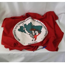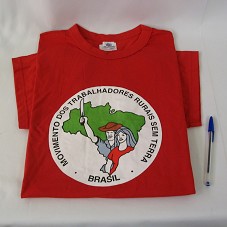 CAMISETA (TAM GG) EM MALHA VERMELHA, DE MANGA CURTA. NA FRENTE, ESTAMPA COM CÍRCULO BRANCO CONTENDO A LOGOMARCA DO 'MOVIMENTO DOS TRABALHADORES RURAIS SEM TERRA'. ATRÁS, 'MARCHA NACIONAL PELA REFORMA AGRÁRIA / 1 A 17 MAIO/2005'.