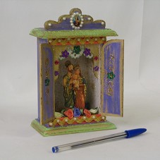 MINI ORATÓRIO (14,5X11X6,5 CM) PINTADO EM PÁTINA NAS CORES LILÁS COM DOURADO E VERDE COM DOURADO. POSSUI IMAGEM EM RESINA DE MARIA E JOSÉ SEGURANDO JESUS EM SEUS BRAÇOS. ENFEITADO COM ROSAS DE CETIM E PEDRARIA. NO FUNDO DA BASE ETIQUETA COM A INSCRIÇÃO 'SUZE ORATÓRIOS ARTESANAIS / (61) 9161-3033'.