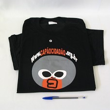 CAMISETA (TAM M) EM MALHA PRETA. NA FRENTE, ESTAMPA MOSTRANDO UMA ROSTO NEGRO ESTILIZADO, E A INSCRIÇÃO 'WWW.CAPÃOCIDADÃO.ORG.BR'. ATRÁS, MESMA ESTAMPA EM TAMANHO REDUZIDO.