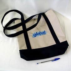 SACOLA EM LONA BEGE, COM DETALHES E ALÇAS EM AZUL MARINHO. NA FRENTE, BOLSO FORNTAL, ONDE HÁ BORDADO 'GLOBAL EDITORA', EM TONS DE AZUL.