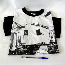 CAMISETA (TAM M) EM MALHA PRETA. NA FRENTE, ESTAMPA COM FOTOGRAFIA EM PRETO E BRANCO MOSTRANDO UMA CASA EM PALAFITAS.