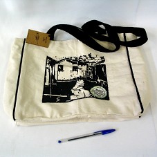 BOLSA EM ALGODÃO CRU, COM ALÇAS E DETALHES EM PRETO. NA FRENTE, ESTAMPA COM FOTOGRAFIA EM NEGATIVO, MOSTRANDO UMA CASA EM PALAFITAS, E UM CARIMBO COM A INSCRIÇÃO 'MARÉ / RIO DE JANEIRO / BRASIL'. ACOMPANHA CARTÃO POSTAL E UM CARTÃO COM A INSCRIÇÃO 'ASSOCIAÇÃO DE ARTESÃS / MARIAS MARÉ / ARTE DA FAVELA'.