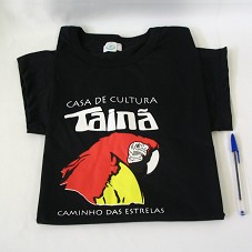 DUAS CAMISETAS (TAM G E GG) EM MALHA PRETA. NA FRENTE, ESTAMPA MOSTRANDO UMA ARARA VERMELHA DE PEITO AMARELO, E A INSCRIÇÃO 'CASA DE CULTURA TAINÃ / CAMINHO DAS ESTRELAS'. ATRÁS, EM CINZA, 'ORQUESTRA TAMBORES DO AÇO'.