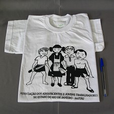 CAMISETA (TAM M) EM MALHA BRANCA, DE MANGA CURTA. NA FRENTE, ESTAMPA EM PRETO, DESENHO DE QUATRO PESSOAS E A INSCRIÇÃO 'ASSOCIAÇÃO DOS ADOLESCENTES E JOVENS TRABALHADORES DO ESTADO DO RIO DE JANEIRO - AAJT/RJ'. ATRÁS, NOMES DE ENTIDADES DE APOIO E CONTATOS DA ASSOCIAÇÃO: 'TELEFAX: 2240-7399 / 2544-7784 / WWW.AJTRJ.ORG.BR /...'.