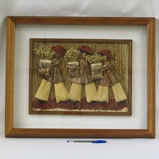 QUADRO (48X59 CM) COM MOLDURA EM MADEIRA CLARA E TAMPO DE VIDRO, TIPO CAIXA. EMOLDURA COMPOSIÇÃO (29X40 CM) COM TRÊS BONECAS DE PALHA QUE CARREGAM CESTAS COM FLORES. NO CANTO INFERIOR DIREITO, ASSINATURA DA ARTISTA, 'ESTER FREITAS'. ACOMPANHA CARTÃO DE VISITA DO REMETENTE.