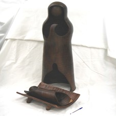 ESCULTURA EM ARGILA (97 CM), FIGURA FEMININA ESTILIZADA, EM ALUSÃO À VIRGEM SANTA. NO CANTO INFERIOR ESQUERDO, A INSCRIÇÃO 'LEMBRANÇA DO POTI VELHO / ARTESÃO CARLIM'. ACOMPANHA UMA MANJEDOURA (29X41,5 CM) COM UMA CRIANÇA EMBRULHADA (47 CM), AMBOS EM MESMO MATERIAL.
