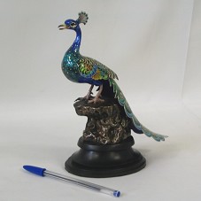 ESCULTURA (19,5X16X6 CM) EM PRATA ESMALTADA, FIGURA DE UM PAVÃO DE CAUDA LONGA, PREDOMINANDO AS CORES VERDE E AZUL. FIXADO EM BASE DE MADEIRA ESCURA. ACONDICIONADO EM CAIXA FORRADA DE VELUDO AZUL MARINHO. ACOMPANHA LIVRETO EXPLICATIVO 'ENAMELED SILVER ARTIFACTS' E CERTIFICADO DE GARANTIA.