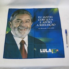LENÇO(45,5X45,5 CM) EM TECIDO COM FUNDO AZUL, TRAZENDO FOTOGRAFIA DO PRESIDENTE LULA, COM A INSCRIÇÃO 'EU JANTEI COM LULA E APÓIO A REELEIÇÃO / SÃO BERNARDO, 13-07-2006'.