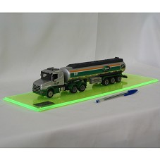 MINIATURA DE UM CAMINHÃO DE COMBUSTÍVEL (31,5X7X6 CM), COM CORPO EM METAL E DETALHES EM PLÁSTICO. PINTADO NA COR PRATEADA, COM FAIXA NAS CORES LARANJA, BRANCA E VERDE, E LOGOMARCA DA PETROBRÁS, 'BR'. POSSUI A INSCRIÇÃO 'BIODIESEL / PETROBRÁS'. NO TANQUE DO CAMINHÃO, 'PROGRAMA NACIONAL DE PRODUÇÃO E USO DO BIODIESEL / DECRETO PRESIDENCIAL S/N DE 23 DE DEZEMBRO DE 2003'. FIXADO EM BASE DE ACRÍLICO VERDE-LIMÃO, COM REDOMA EM MESMO MATERIAL. ACONDICIONADO EM CAIXA PRETA.