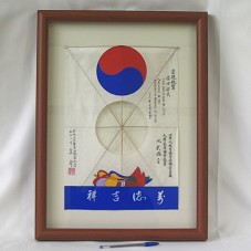 QUADRO (59,5X44,5 CM) COM MOLDURA EM MADEIRA AVERMELHADA E TAMPO DE VIDRO. EMOLDURA UMA PIPA COREANA, DE FORMATO RETANGULAR (42,5X30 CM), COM A BARRA PINTADA EM AZUL E DESENHO DE DUAS AVES. NA PARTE SUPERIOR, A SIMBOLOGIA YING-YANG PINTADA NAS CORES AZUL E VERMELHO. POSSUI INSCRIÇÕES EM IDEOGRAMAS. ATRÁS, PLACA EM METAL DOURADO, COM GRAVAÇÃO EM INGLÊS, SOBRE A OBRA, E CUMPRIMENTANDO O PRESIDENTE LULA PELA REELEIÇÃO.