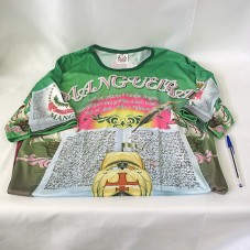 DUAS CAMISETA IGUAIS (TAM G), OFICIAIS DA ESCOLA DE SAMBA MANGUEIRA, EM MALHA COLORIDA, PREDOMINANDO A COR VERDE E ROSA, DE MANGA CURTA. POSSUI DESENHO DE UM LIVRO ABERTO, COM UMA CARAVELA À SUA FRENTE, E A INSCRIÇÃO 'MANGUEIRA / MINHA PÁTRIA É MINHA LÍNGUA, MANGUEIRA MEU GRANDE AMOR. MEU SAMBA VAI AO LÁCIO E COLHE A ÚLTIMA FLOR'.