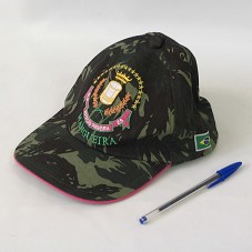 DOIS BONÉS IGUAIS, COM ESTAMPA EM TONS DE VERDE, ESTILO MILITAR. NA FRENTE, BORDADO COM A LOGOMARCA DA 'G.R. ESTAÇÃO PRIMEIRA MANGUEIRA'. NAS LATERAIS, BANDEIRA DO BRASIL.