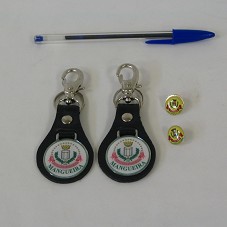 DOIS BÓTONS IGUAIS (1,5 CM), DE FORMATO CIRCULAR, EM METAL DOURADO, COM LOGOMARCA DA 'G.R. ESTAÇÃO PRIMEIRA MANGUEIRA'. ACOMPANHA DOIS CHAVEIROS IGUAIS (10,56 C M), EM COURO PRETO, COM DETALHES EM METAL PRATEADO, POSSUINDO NA FRENTE, MEDALHA COM MESMA LOGOMARCA.