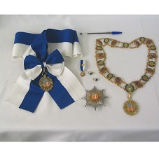 ORDEM DO CONGRESSO DE ANGOSTURA, NO GRAU DE GRANDE COLAR, COMPOSTA POR: FAIXA NAS CORES AZUL E BRANCO, COM ROSETA NA PONTA E MEDALHÃO CIRCUNDADO POR RAIOS, EM METAL, COM DESENHO MOSTRANDO A PERSPECTIVA DE UM PRÉDIO, NO ANVERSO, 'ORDEN CONGRESO DE ANGOSTURA' E BRASÃO; UM GRANDE COLAR, EM METAL DOURADO, COM MESMO MEDALHÃO E CORDÃO CONFECCIONADO COM MEDALHAS QUE POSSUEM AS INICIAIS DO CONGRESSO E O BRASÃO; DOIS BÓTONS EM TECIDO AZUL E BRANCO; UMA PLACA COM MESMA INSÍGNIA, CIRCUNDADA POR RAIOS PRATEADOS; E UMA MINIATURA DA INSÍGNIA FIXADA EM FITA AZUL E BRANCA, COM BRASÃO. CONJUNTO ACONDICIONADO EM CAIXA FORRADA DE NAPA VINHO, TENDO NA TAMPA O NOME DA ORDEM.