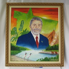 PINTURA SOBRE TELA (89,5X79 CM), RETRATANDO O PRESIDENTE LULA, TENDO AO FUNDO O MAPA DO MATO GROSSO, E COMO PAISAGEM, O PANTANAL MATOGROSSENSE. NO CANTO ESQUERDO, DESENHO DE MAMONAS. NO CANTO INFERIOR DIREITO, ASSINATURA DO ARTISTA, 'VICTOR HUGO / 2006'. MOLDURA COM DETALHES EM ALTO RELEVO, PINTADA EM MARROM E DOURADO; PASSE-PARTOUT BEGE COM FRISO DOURADO. ATRÁS, DUAS DEDICATÓRIAS DO AGENTE, 'NASCE UM NOVO TEMPO PARA O AGRONEGÓCIO E O MEIO AMBIENTE EM MATO GROSSO' E 'AO AMIGO PRESIDENTE LULA COM OS CUMPRIMENTOS DE TODO ESTADO DE MATO GROSSO. BLAIRO BORGES MAGGI / GOVERNADOR / SAPEZAL MT 20/11/06'. POSSUI AINDA A ASSINATURA DA PRIMEIRA-DAMA DESTE ESTADO.