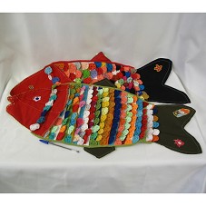 DOIS TAPETES (80X40 CM) EM FORMATO DE PEIXE, CONFECCIONADOS COM RETALHOS E FUXICOS COLORIDOS.